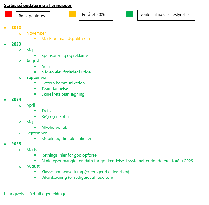 | Punkt 5 | 10 min | Princip for skole/hjemsamarbejdet opdateres på hjemmesiden |